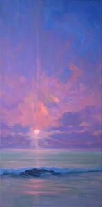 This unusual format for a skyscape reflects a slice of the sky at sunset. Oil on linen.