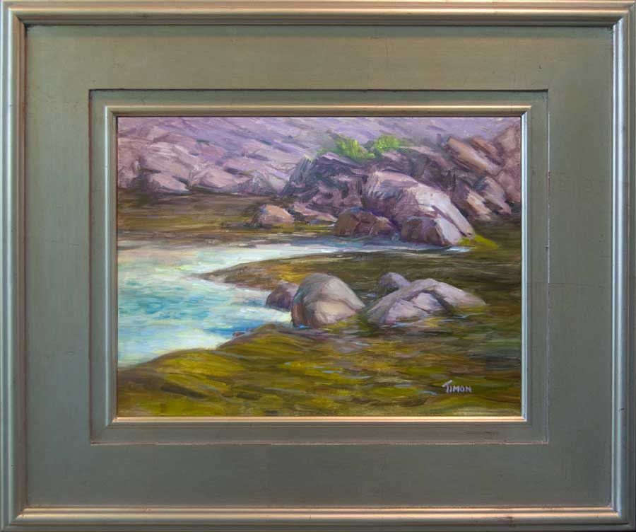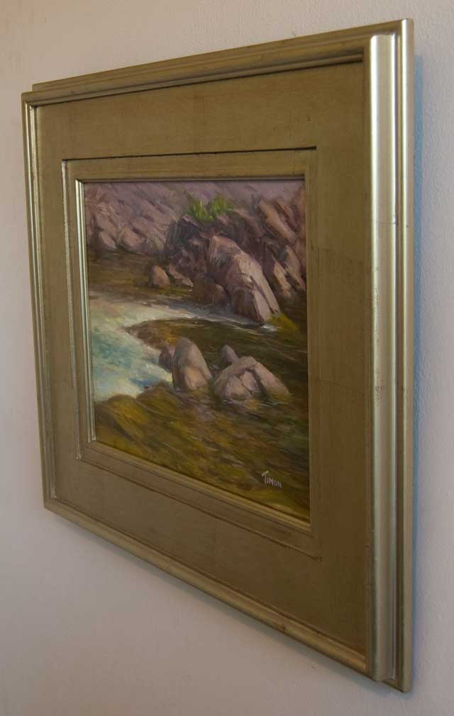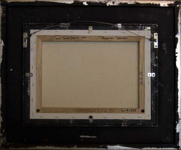 Oil on canvas in a solid wood hand-leafed warm silver frame.