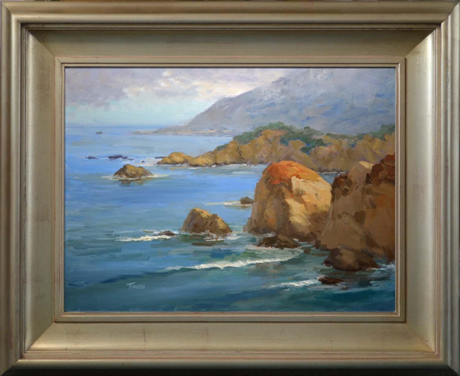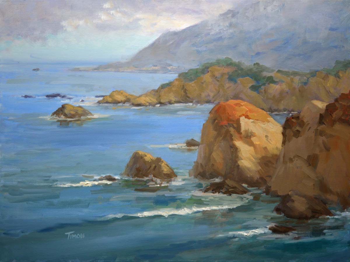 One morning on the coast I found myself socked in by fog. I started driving south, and eventually I found a hole in the weather. The day just started to open up as I was painting, revealing the most beautiful and fleating lighting effects on the cliffs.