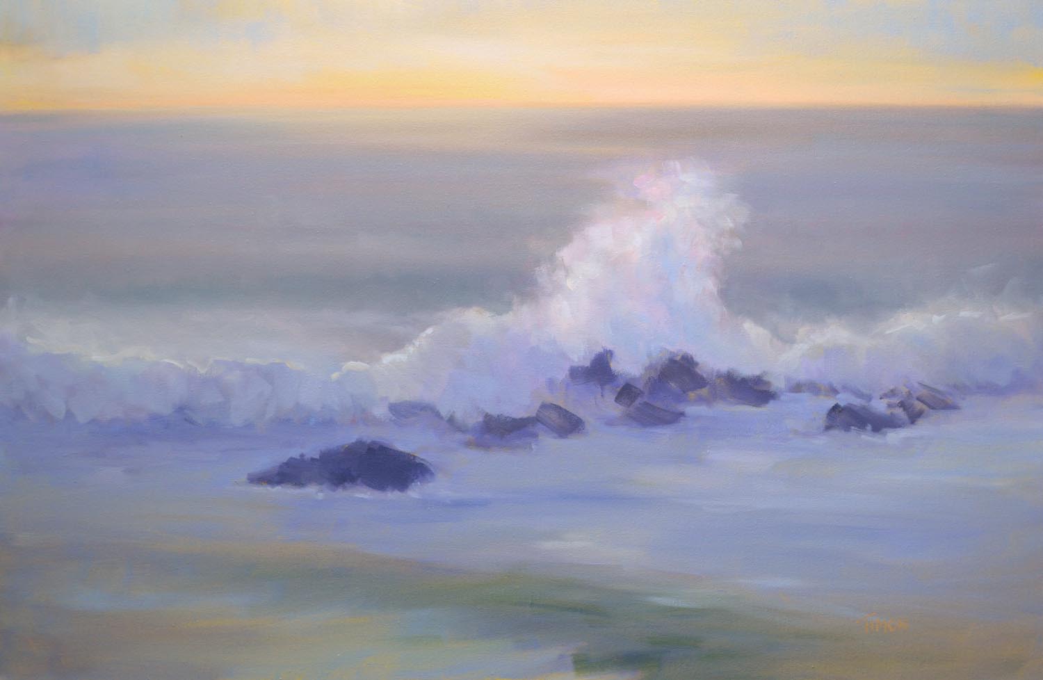 With the sun going down, the surf catches backlit lighting and becomes illuminated.