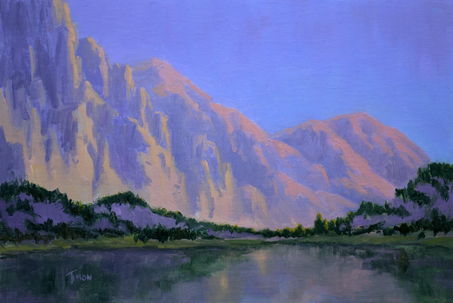 This is from a backpacking trip. This glorious view was how I was greeted the first morning as I looked over Lake Chickenfoot in the Red Rock Creek section of the eastern Sierra. This is oil on linen, mounted on a gatorboard panel. Framed in a silver leaf plein air style frame.