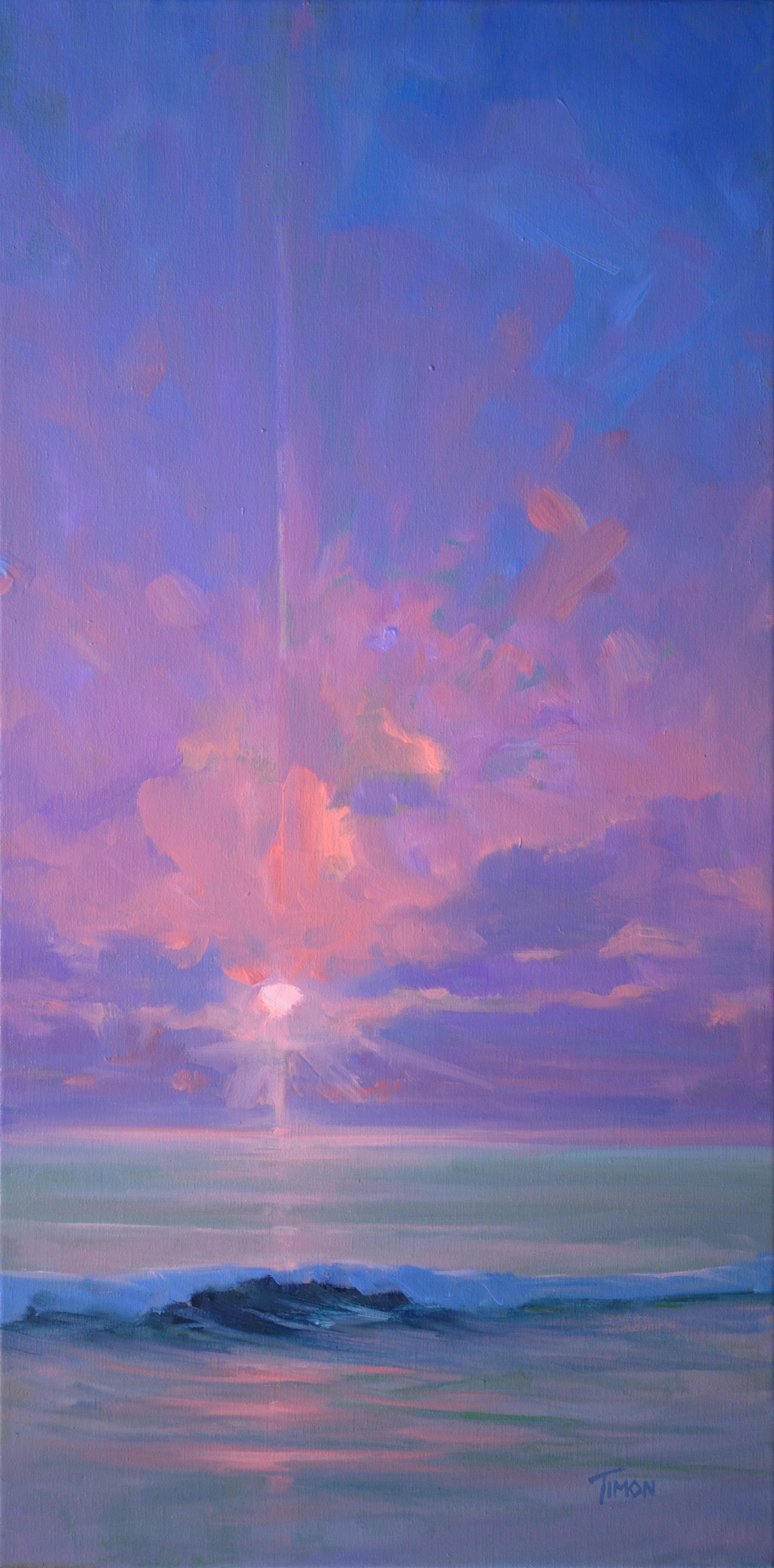 This unusual format for a skyscape reflects a slice of the sky at sunset. Oil on linen.